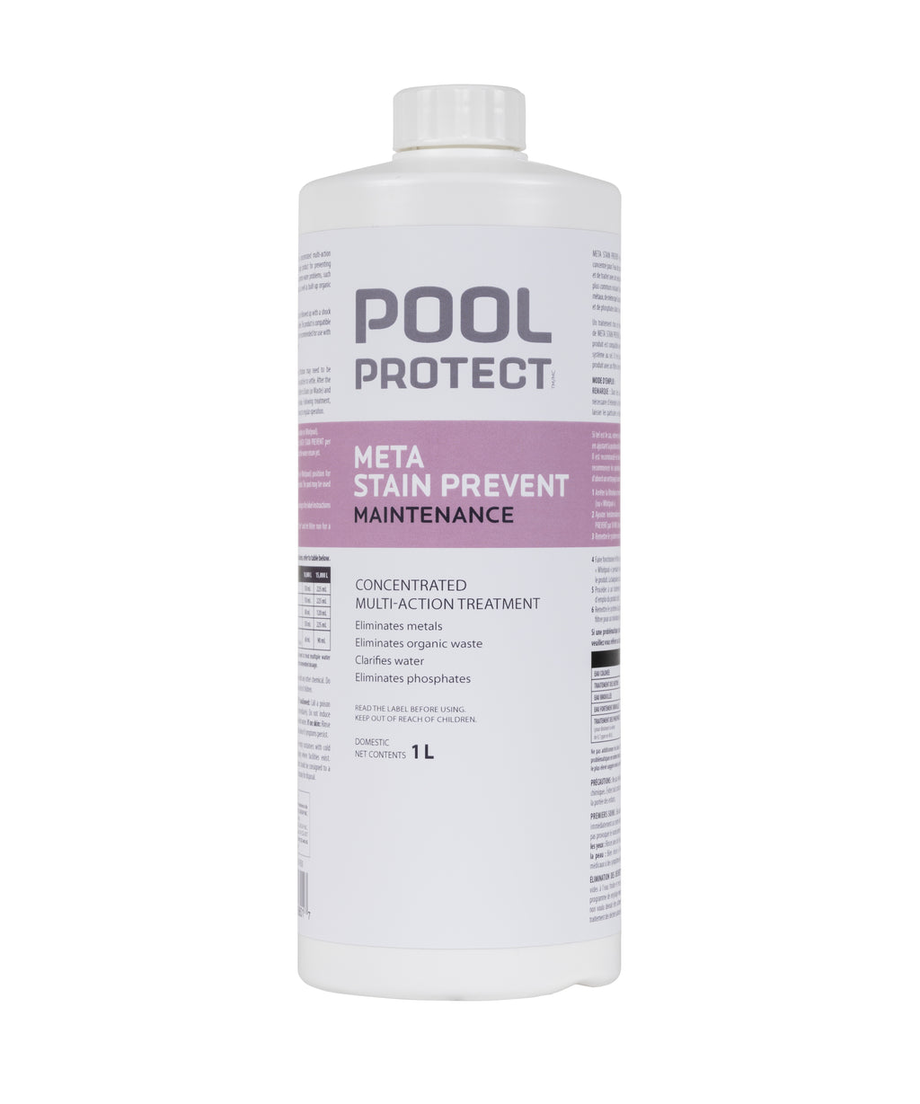 - Weekly treatment: To protect pool equipment and increase its life span, add 30 mL of META Stain Prevent per 10,000 L of pool water.