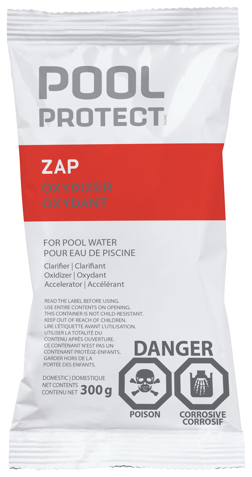 ZAP is a pre-measured shock treatment that actively eliminates organic waste and maintains water clarity in a single weekly treatment. This re-activating treatment restores water’s sparkle while prolonging the effect of chlorine.